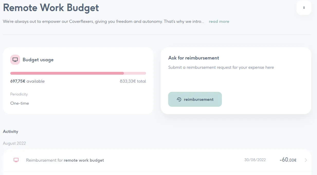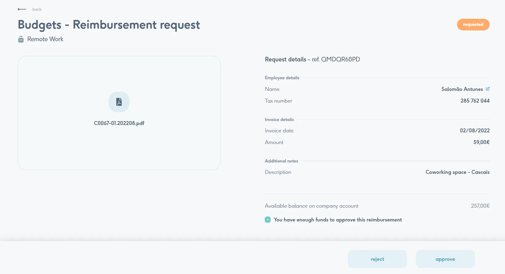 The reimbursement process is similar to that for benefits. However, there is a small difference: when it comes to budgets, all balances allocated are merely an indication, and all refunds are made through the company's Coverflex account - the company just needs to ensure that they have sufficient funds in their account before approving the refund.