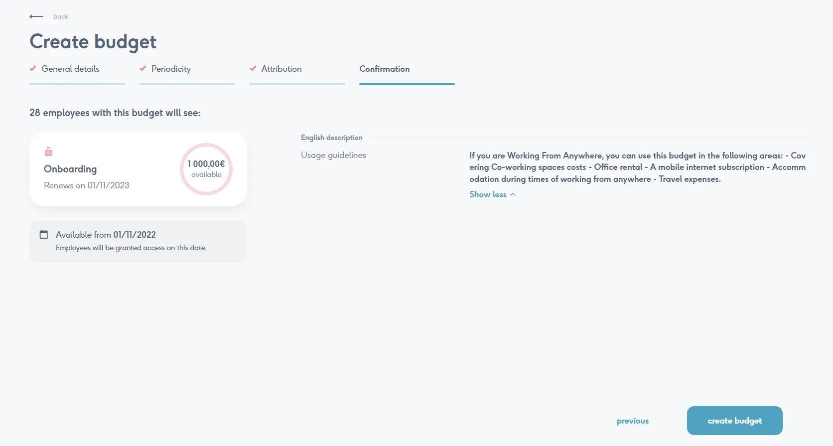 Finally, all there is left to do it click on “confirm” and… that's it! The day it starts, the budget is visible to employees and they can start submitting their refunds immediately.