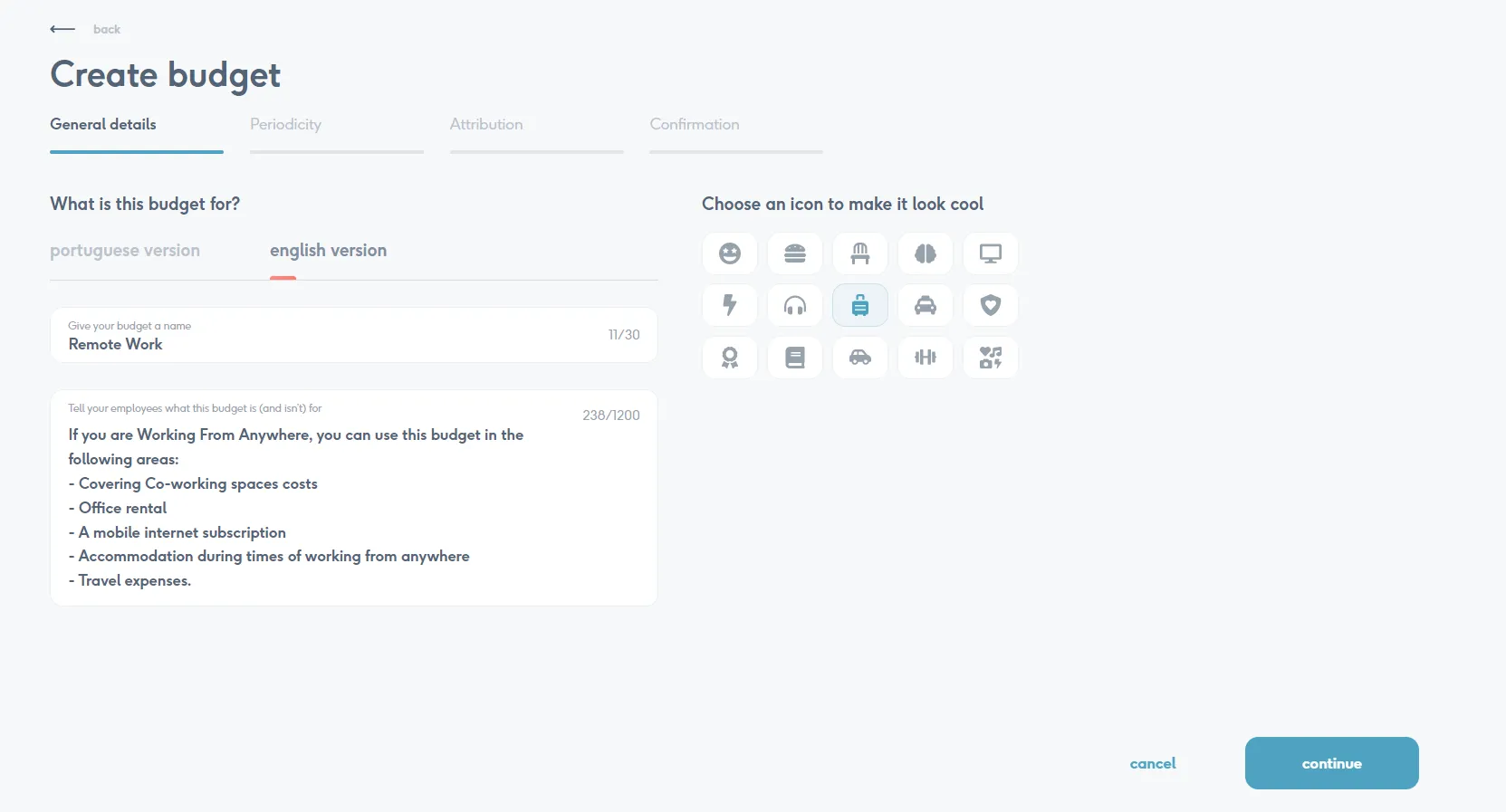 Unlike the benefits that are tax exempt (or partially tax exempt), which interface is defined by Coverflex, the way budgets show to employees are completely defined by the company. The first step when creating a budget is to choose a name, write a description, so that the employee knows the purpose of the budget, and - most importantly - choose an icon.