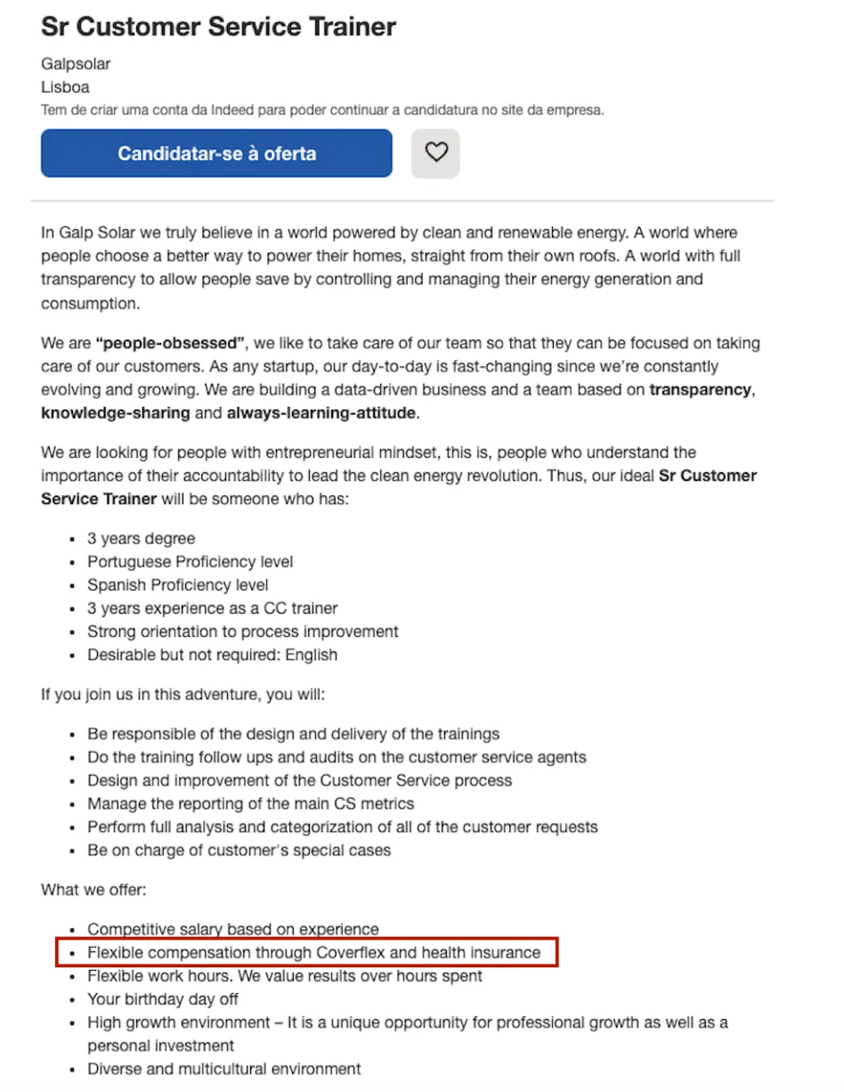 “At Coverflex we mention the perks we offer in the job ads, such as budgets, health insurance, flexible benefits, the fact that we are 100% remote, the fact that we give the employee the birthday and the children’s birthdays, among many others", exemplifies Laura Moreira.