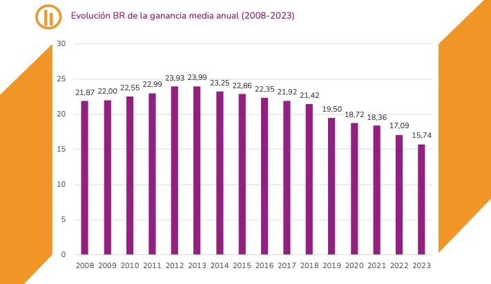 La ganancia media anual de los hombres fue de 30.372,49 euros frente a los 25.591,31 euros de las mujeres, una diferencia de 4.781 euros anuales. La tendencia es positiva: la brecha más elevada de la serie se produjo en 2013, con un 23,99%, y desde entonces ha ido bajando de forma lenta e irregular.