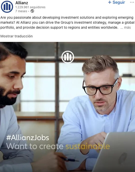 Allianz España utiliza LinkedIn y otros canales para compartir iniciativas de diversidad, bienestar y testimonios de empleados contando su experiencia.