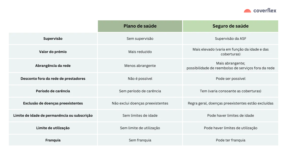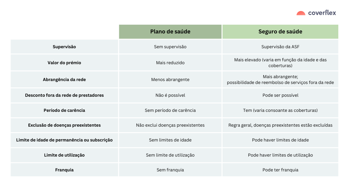 Relativamente à abrangência de serviços e à rede de prestadores, o seguro de saúde é mais vantajoso, já que, por norma, inclui mais coberturas, como hospitalização e alguns tratamentos, assim como a possibilidade de aceder a médicos e estabelecimentos fora da rede, com reembolso de parte da despesa. Com um plano de saúde, o cliente fica limitado a uma rede de prestadores definida e, regra geral, a preços mais elevados do que com um seguro saúde. É também por este motivo que os planos de saúde têm, na generalidade dos casos, preços mais atrativos do que os seguros de saúde. Além disso, nos planos de saúde, o preço não varia com a idade.