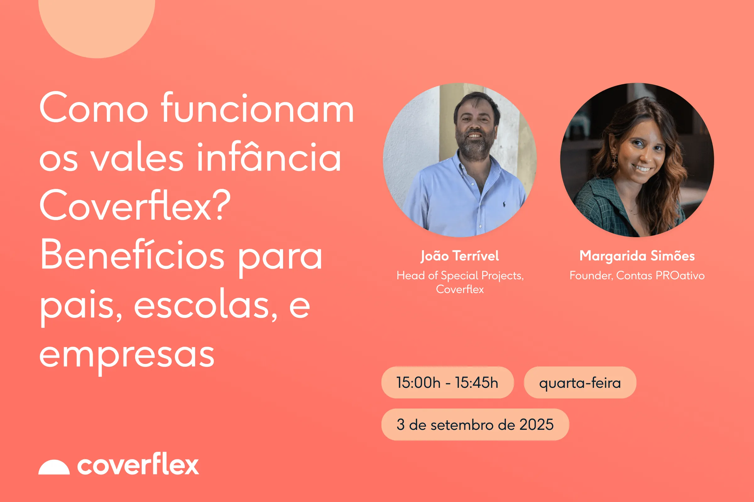 Como funcionam os vales infância para pais, escolas, e empresas? E porque é que tantas escolas já preferem trabalhar com a Coverflex? Este webinar reuniu Margarida Simões, Contabilista e fundadora do ContasPROativo, e João Terrível, Head of Special Projects na Coverflex, e foi moderado por Laura Moreira, Senior People Specialist na Coverflex.
