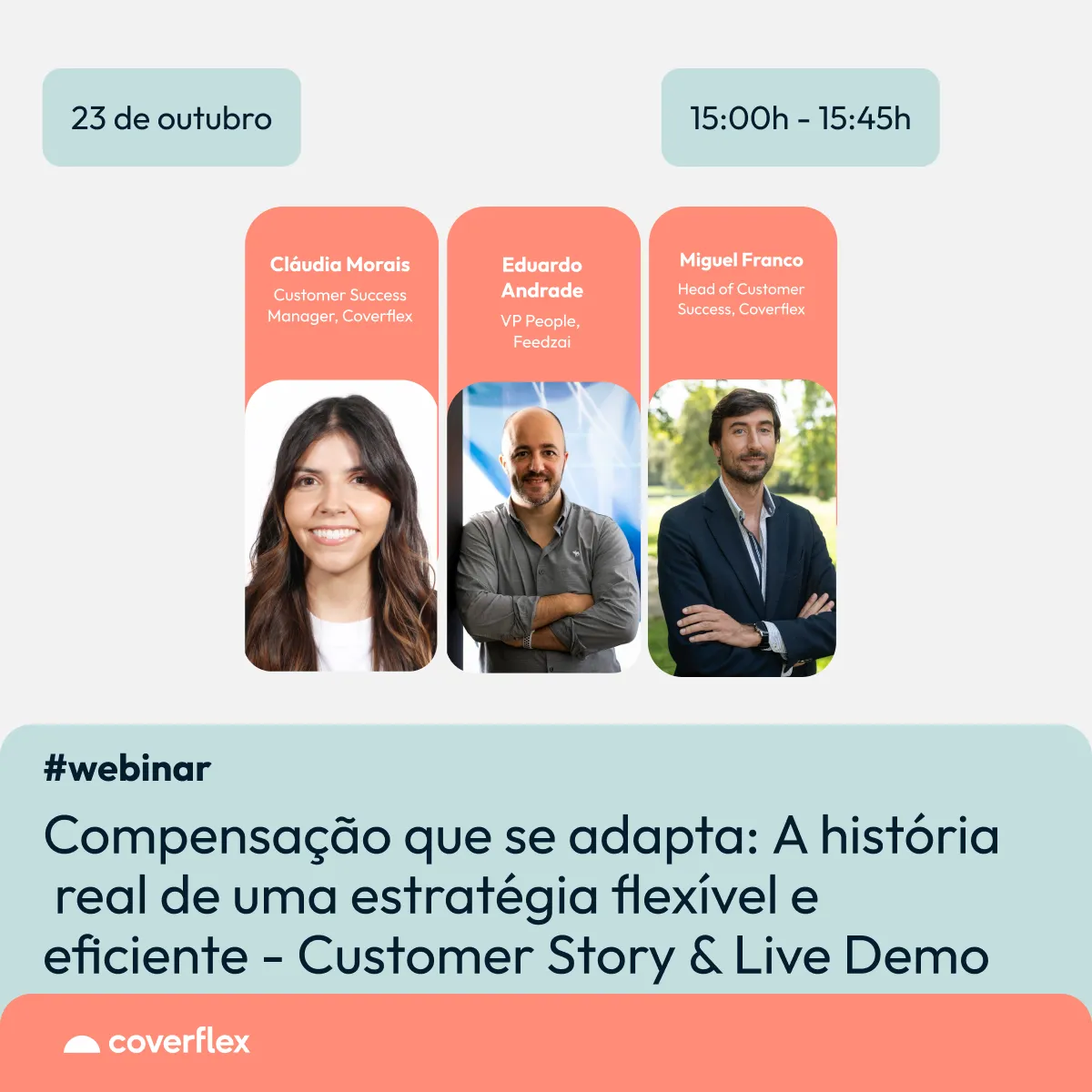 Neste webinar, Eduardo Andrade, VP of People na Feedzai, e Miguel Franco, Head of Customer Success na Coverflex, falam sobre os desafios, as decisões, e os resultados de uma estratégia mais personalizada e eficiente. No final, Cláudia Morais, Customer Success Manager na Coverflex, mostra, na prática, como esta abordagem se traduz numa experiência simples eficiente e clara para RH e para cada colaborador.