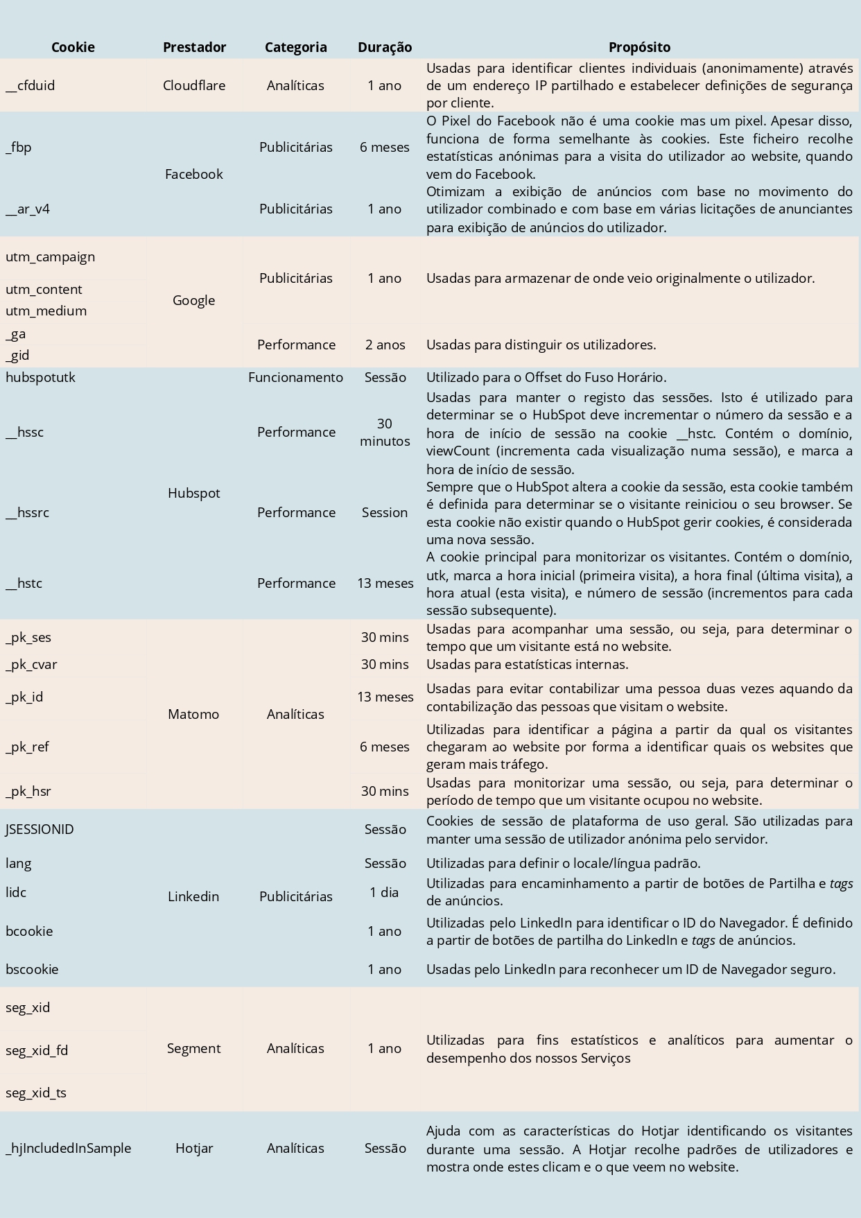 Algumas das cookies que utilizamos pertencem a empresas terceiras, nomeadamente à Google Analytics, Matomo, Facebook, Linkedin, Hubspot, Hotjar, Cloudflare e Segment por forma a fornecer-nos informação analítica e inteligente sobre o nosso website.